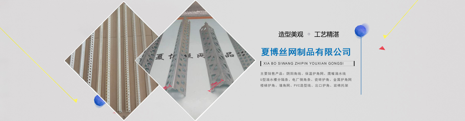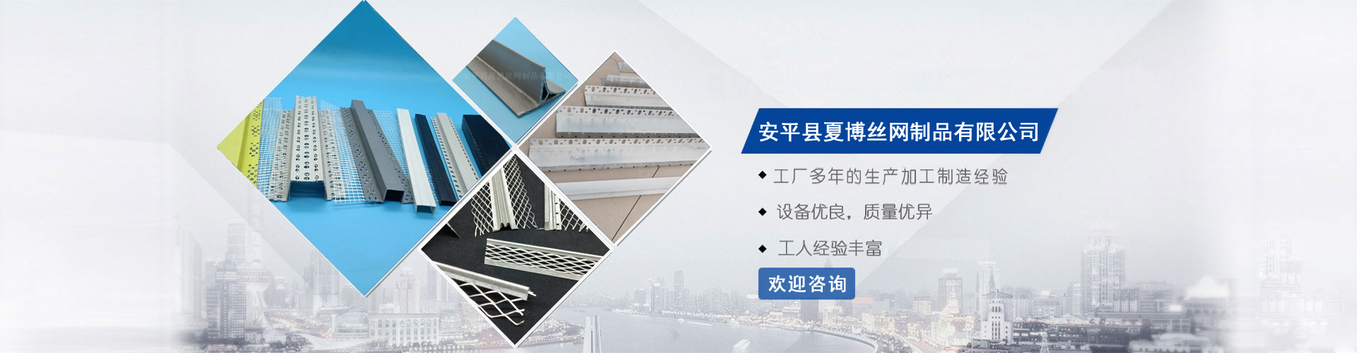 河北省安平縣夏博絲網制品有限公司旗下安平縣晟友絲網制品廠(原晟昌絲網制品廠)位于中國有名的“絲網之鄉”—安平,周圍與北京、天津、 石家莊等多個城市相交接,交通十分便利,可以往全國各地發貨。公司現有建筑墻角裝飾為"角歐樂"。  本廠創建于2010年,公司追求優質的產品,以質量為基礎,施工方便快捷為主,研發各種新型建筑 、裝飾所用的建材產品。夏博公司現有產品:油漆工專用陰、陽角PVC護角條、可彎護角,圓弧護角條,泥水工專用內外墻保溫護角、樓梯護角、外墻分隔...